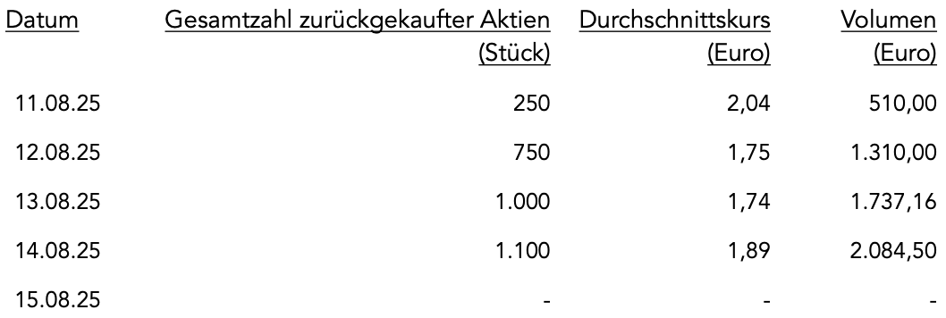 Im Zeitraum vom 11. August 2025 bis einschließlich 15. August 2025 wurden 3.100 Aktien im Rahmen des Aktienrückkaufs erworben. Der Beginn des Aktienrückkaufs wurde mit Bekanntmachung vom 02. September 2024 gemäß Artikel 5 der Verordnung (EU) Nr. 596/2014 und gemäß Art. 2 Abs. 1 der delegierten Verordnung (EU)2016/1052 mitgeteilt.